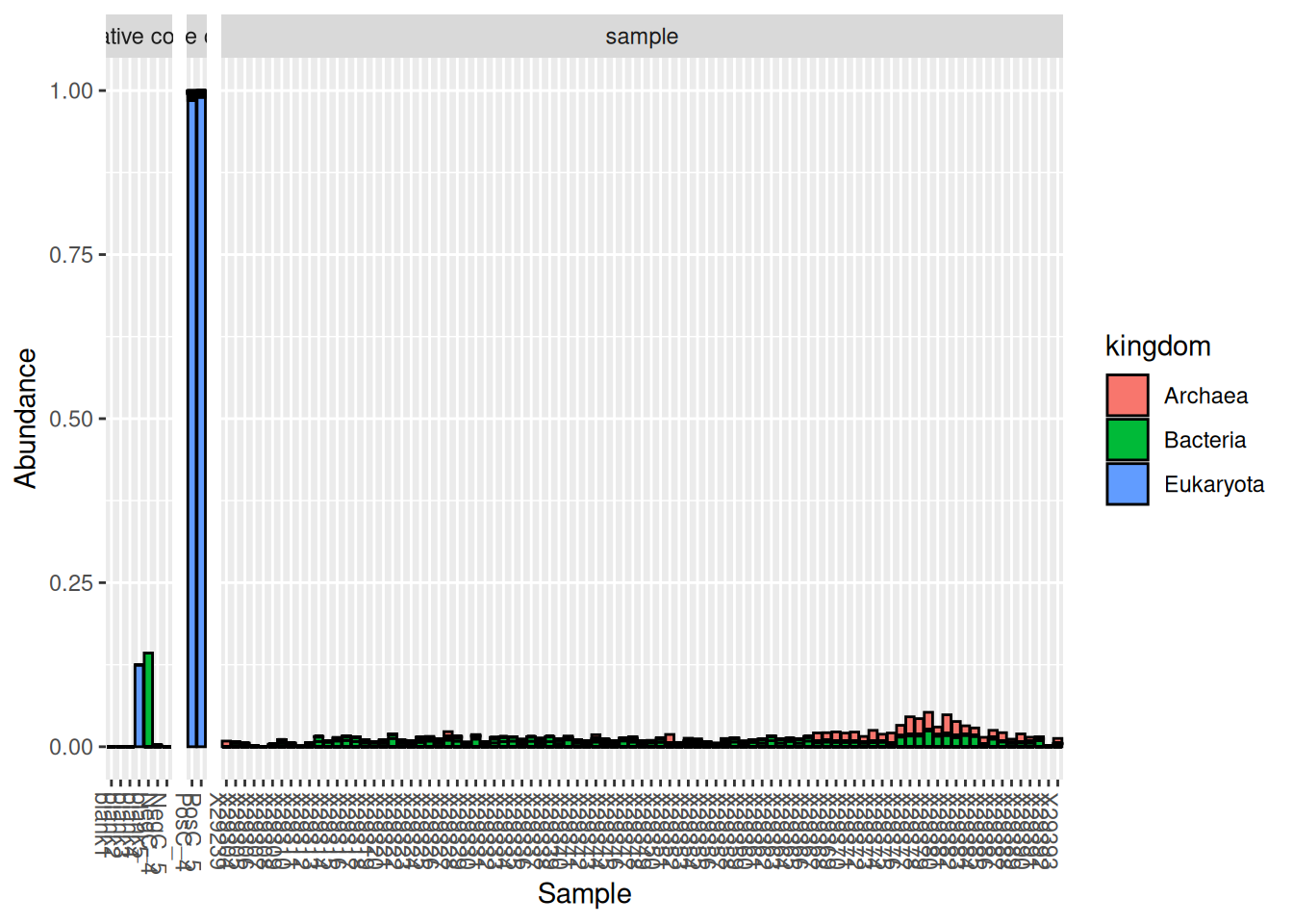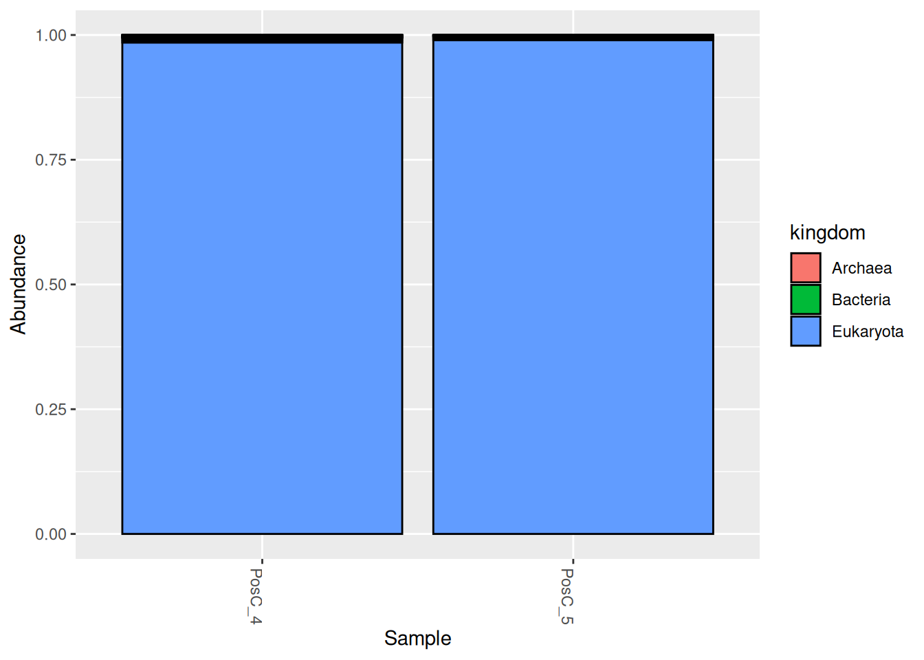 As can be seen on this graph, the synthetic community added to these samples was composed of Eukaryota, but some additional contaminants (probably from true samples) can also be found in the positive controls. The issue of contaminants can be dealt with using the R package decontam as demonstrated in the previous section: Dealing with negative controls.